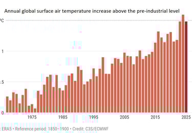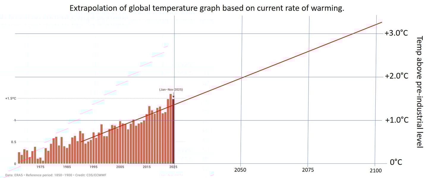 2025 was the second warmest year globally, tied with 2023. On average, 2023, 2024 and 2025 were more than 1.5°C warmer than the pre-industrial age. The Paris accord is dead, 75 years before the end of the 21st century.