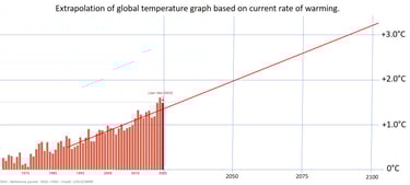 What lies ahead, however, is far more calamitous. Fig. 2 is not some doom-mongering rhetoric. It is a simple mathematical fact that even graphically-challenged politicians can understand: a prediction of global temperature increase up to the end of this century based on the current rate of increase, i.e. assuming that nothing changes before 2050. Make no mistake. The greenhouse gases currently in our atmosphere are going to remain in our atmosphere for many years (CO2 - hundreds of years) to come. Their impact on global temperature will continue well beyond 2100. If we add more (we are) then we will not see a slowing of global warming. Figure 2 displays a future which has become more likely than not, no matter how many solar panels or wind turbines we erect.