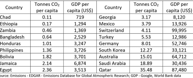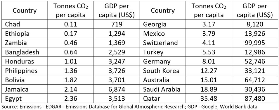 A word of warning when interpreting the data in Table 1. Switzerland seems to be bucking the trend of high GDP with high emissions. Instead, its highly productive economy generates great wealth for its citizens while apparently keeping its per capita CO2 emissions on a par with middle to low income countries. Don’t be fooled. Per capita CO2 emissions don’t take into account the emissions from goods which a country imports or exports. Karine Siegwart, deputy director of the Swiss Federal Office for the Environment recently wrote “Due to its comparatively high consumption level, Switzerland is one of the countries with disproportionately high environmental footprints per capita.” She was right. If emissions generated via imports are counted, the footprint of each resident of Switzerland is 14 tonnes of CO2 per year. In comparison, the global average is 6 tonnes. Arguments over who ‘owns’ carbon emissions are rampant in the developed world, and never more so than at the COP summits. Carbon emission negotiators have invented ever more ingenious ways to conceal emissions behind smokescreens and thereby lower the demands made of them.