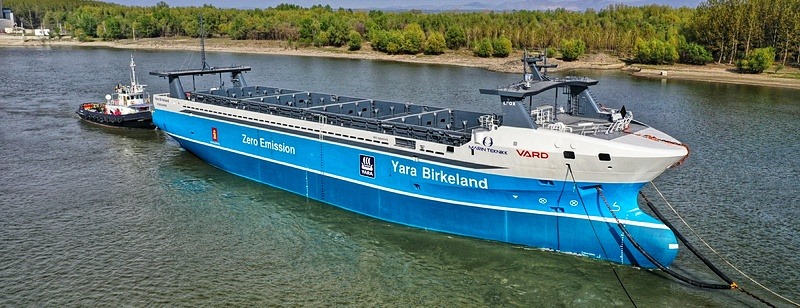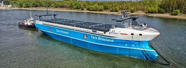 Yara Birkeland sails between Herøya and Brevik, a distance of 13 km carrying chemicals and fertiliser, and is intended to reduce road truck traffic by 40,000 loads per year. The carbon emissions saving is huge. The ship has a maximum speed of 15 knots and a battery capacity of 6.8 MWh. This allows for extended operation between recharging. The vessel is designed to recharge at dedicated onshore charging stations while unloading and loading cargo. The recharge time can fluctuate based on the power supply available at the charging station and the ship's current battery level but times of around 2 hours are sufficient to keep the ship in operation. 98% of Norway's electricity comes from renewable sources making the Yara Birkeland the 'greenest' cargo vessel in service.