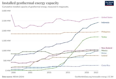 It's Indonesia, a country relying heavily on fossil fuels at present, that has the greatest geothermal potential - 40% of the world's total. It sits on the Pacific Rim of Fire with constant seismic activity and 117 volcanoes! At present, Indonesia generates just 3% of its electricity from 16 geothermal plants. This figure could potentially reach 35% or 29GW. Of course, there are many hurdles to cross before anything like this could be achieved. Geothermal requires massive investment with high start up costs. Most seismic activity takes place in remote regions of the country which would require a huge amount of networking to feed electricity into the national grid.