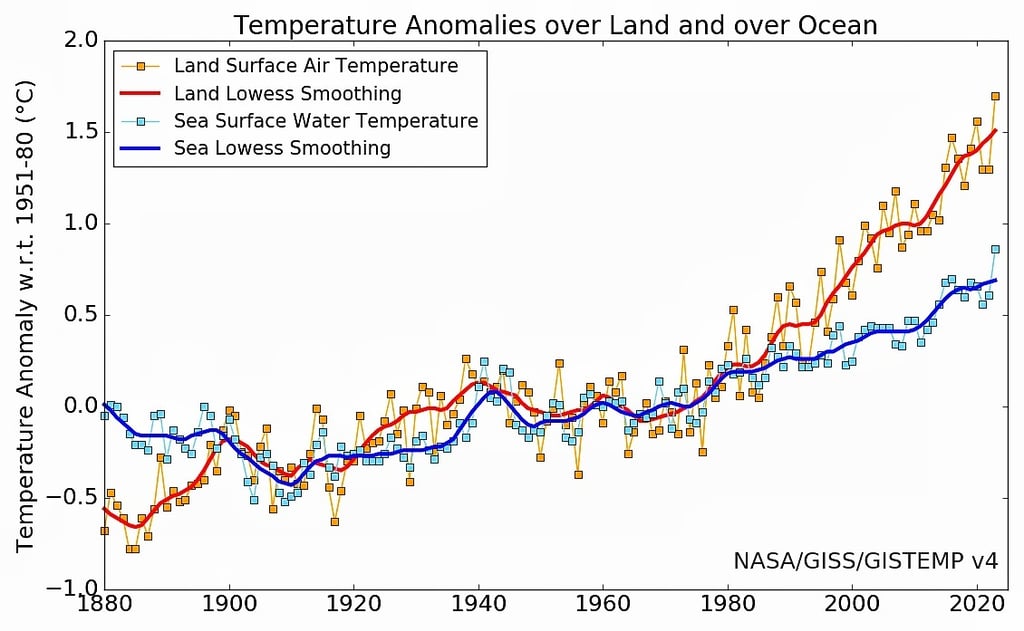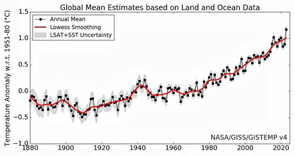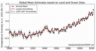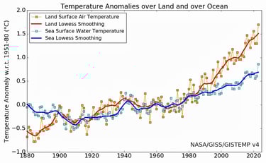 The world is getting warmer, of that there is no doubt. Of course there are people who deny Homo sapiens has anything to do with this warming – the Deniers. But even they can read a thermometer. NASA’s Goddard Institute of Space Studies assembles one of the world's most trusted global temperature records, using a combination of surface air temperature data acquired by tens of thousands of meteorological stations, as well as sea surface temperature data from ship- and buoy-based instruments. Historical measurements dating back to 1880 are derived from historical weather station data.