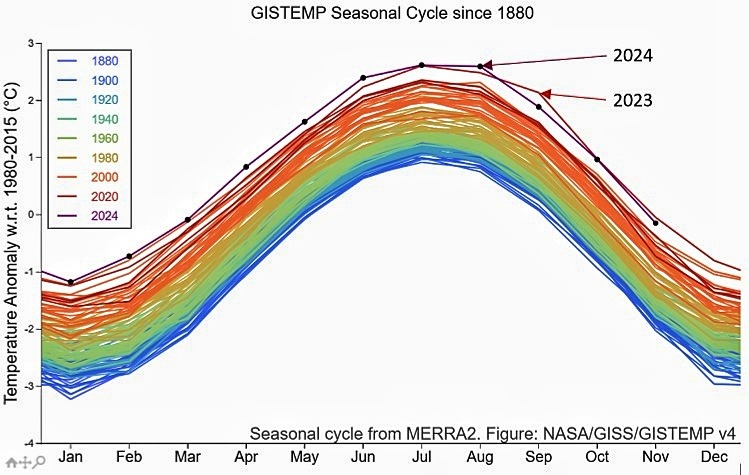 2023 was clearly the warmest year from June through to December. However, 2024 is looking to steal that accolade and become the warmest year ever recorded. [Update: 2024 was the warmest year on record.]