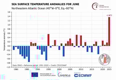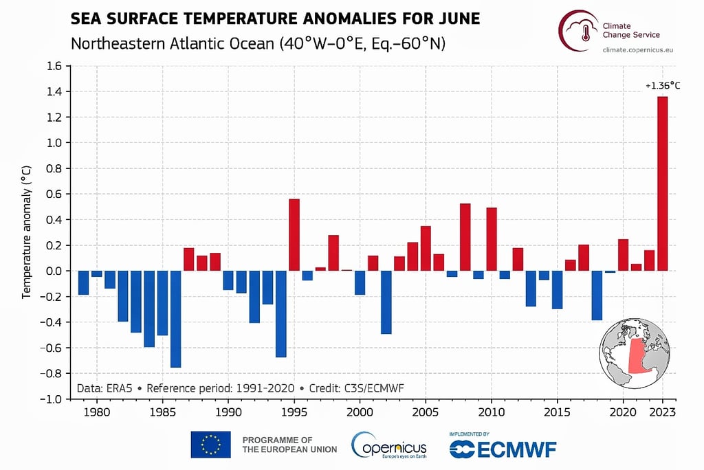 It’s no surprise that the land is heating more quickly than the oceans since it has a lower heat capacity, i.e. it’s easier to heat up. However, what happened in the north-east Atlantic in June 2023 stunned even the most hardened climate scientists.