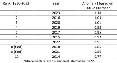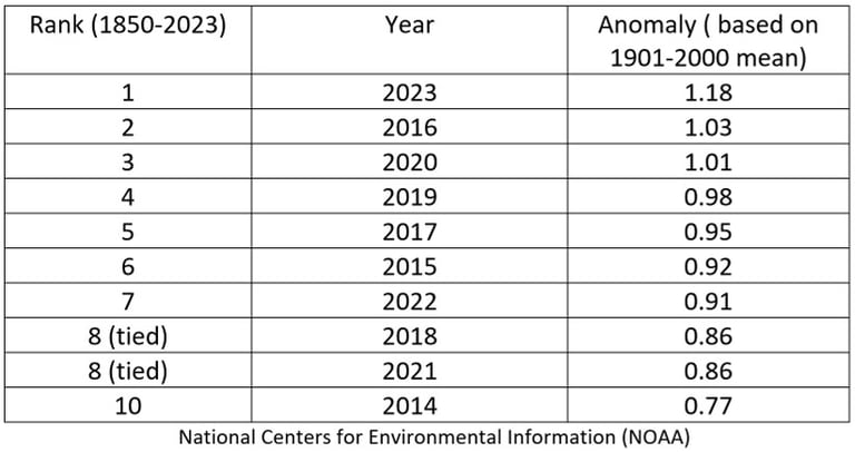 Alarming because every one of the last 10 years is in the table. 2023 was exceptional since it topped the table by a whopping 0.15 degrees. The public perception of 0.15°C is, understandably, a tiny increase, scarcely detectable by human skin. The planet’s skin is many times more sensitive and 0.15°C is a huge leap with dire consequences for us and the other 10 million species.