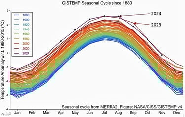 While continued increases in all greenhouse gases was the main factor behind 2023’s record breaking temperature, at the same time, the world was experiencing a medium strength El Niño. This caused the sea surface around the equator in the central and eastern Pacific near South America to become warmer. This acted as a giant heat source in the tropics, which affected atmospheric circulation and acted in concert with man-made warming. The El Niño phenomenon tends to have its greatest effects in its second year and that's exactly what took place. No one, however, could have predicted the margin by which 2024 knocked 2023 into second place. Moreover, January 2025, when the El Niño effect has long since passed, has broken the all-time January temperature record by a huge margin.