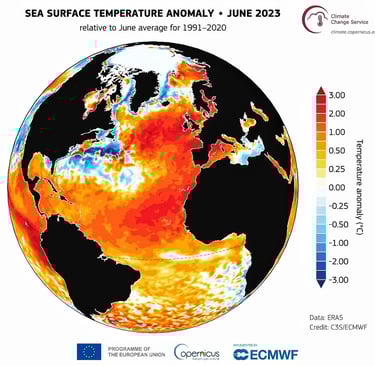 In June 2023, the National Oceanic and Atmospheric Administration (NOAA) issued a category 5 marine heatwave alert (‘Beyond Extreme’ – the highest level) for the Atlantic off the coast of Ireland. Category 4 (‘extreme’) marine heatwave conditions occurred around the rest of Ireland and the U.K., and in the Baltic Sea. What was becoming evident was the pace, magnitude and diversity of impacts that GHGs were having on the climate. In some locations around the UK and Ireland, sea temperatures were 4-5°C above normal.