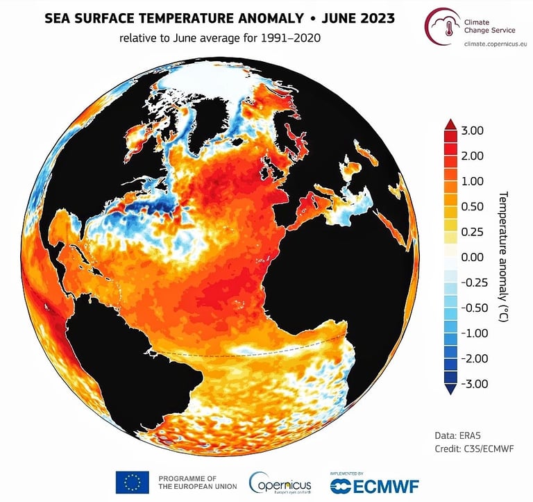 When studying Fig 3, bear in mind the reference value against which the sea surface temperature (SST) is being measured is the 1991-2020 June mean, not pre-industrial, not 1951-80. Climate scientists were anticpating warmer SSTs owing to the developing El Niño in the Pacific Ocean but they were not expecting this: