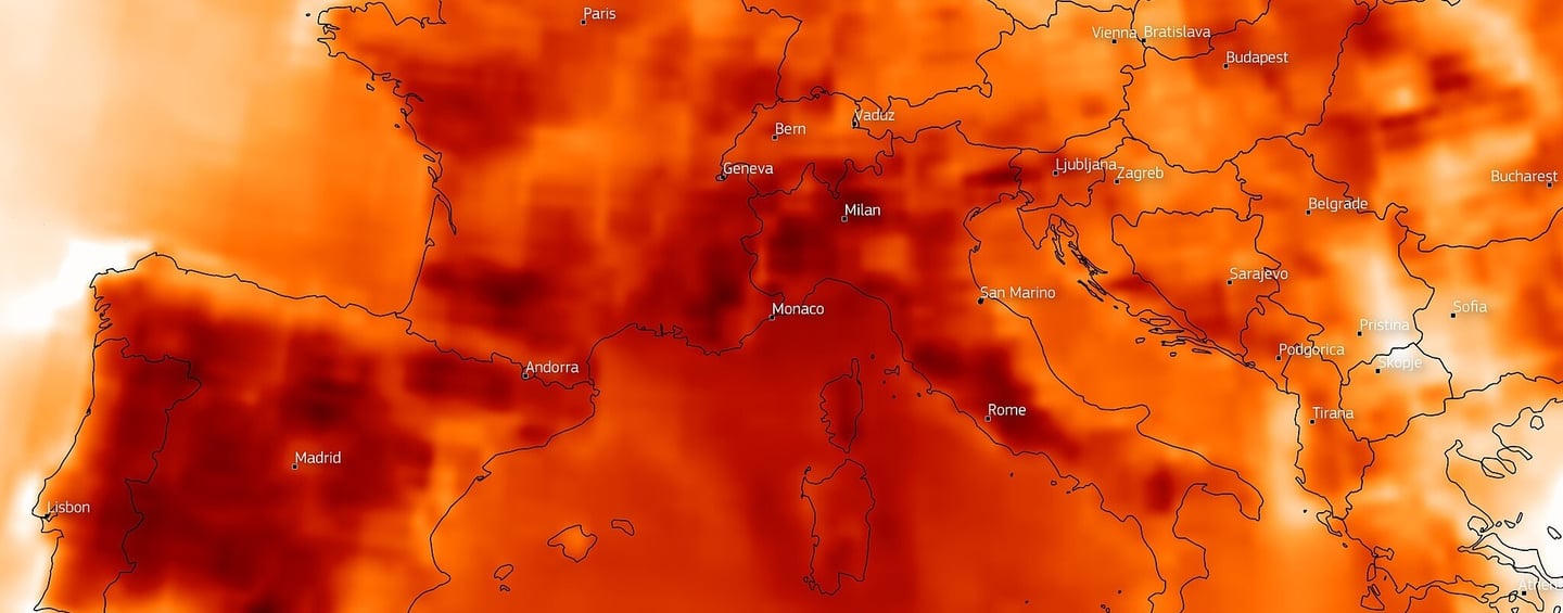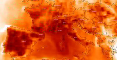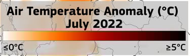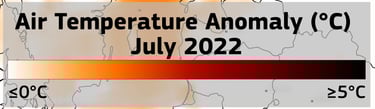 The image above shows Europe in the grip of one of its worst heatwaves in history. The colour displays the temperature anomaly for June 2022 compared with the average June temperatures for the 21st century. Large parts of Europe experienced anomalies of +4°C and numerous European temperature records were broken.