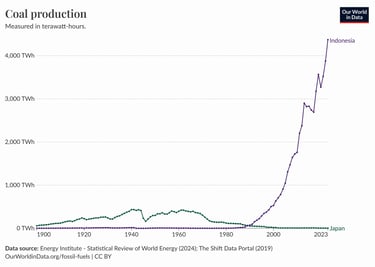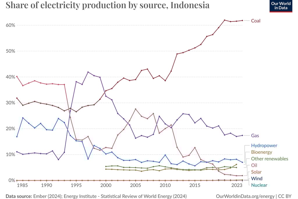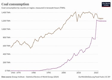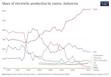 Indonesia is a vast country of some 285 million people. It faces a number of critical environmental issues which for years have blighted the country's 'green' reputation. Foremost among these issues is the country's reliance on fossil fuels and in particular coal. Currently over 60% of its electricity is generated by coal-fired power plants of which there are 90. (See Figure 3 above.) The enormous coal reserves in the country provide energy security and with the small matter of 30 billion tonnes still in the ground, weaning Indonesia off this readily available energy source is going to be extremely difficult. Consider 2024, when Indonesia produced 830.96 million tons of coal. This was a record high and 17% higher than the government's target. Figures 1 and 2 highlight this huge leap in both production and consumption.
