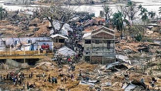 Coastal communities living in hurricane zones face a further deadly threat – storm surges. The atmospheric pressure in the centre of a hurricane is extremely low. When air pressure falls, the sea level rises. If a hurricane reaches landfall during a spring high tide (a tide occurring at a new or full moon), then, with the added force of extremely high winds, sea levels can rise catastrophically. Such an event occurred on November 12, 1970 when the Bhola cyclone struck present-day Bangladesh and India’s West Bengal (Fig. 3). At least 300,000 people died principally as a result of a 10 meter storm surge that tore across the low-lying islands of the vast Ganges Delta.